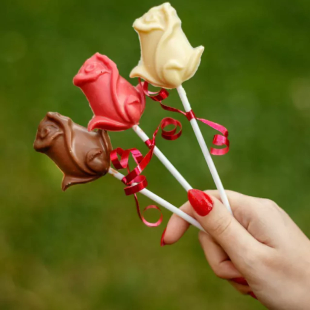 Flores de chocolate con forma de tulipanes y rosas. Pueden ser de Chocolate leche o Blanco o Rosa
